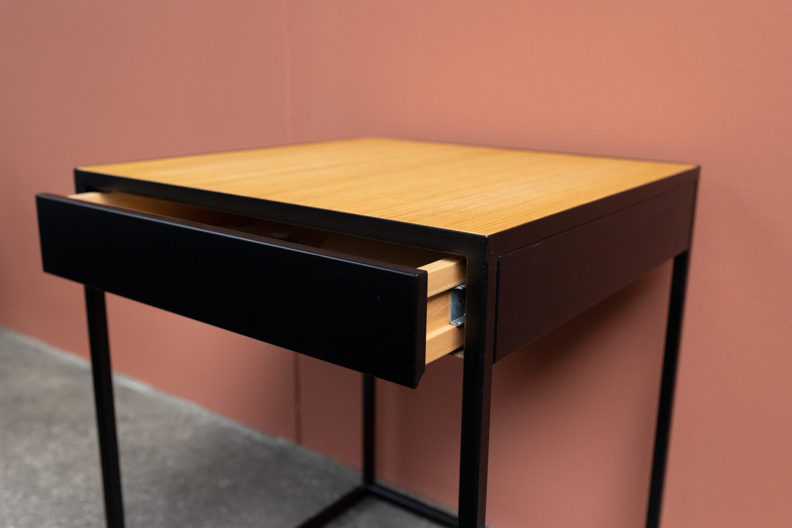Gestell schwarz lackiert, mit Schublade. Platte Eiche geölt, 44 x 44 cm, Höhe 54 cm